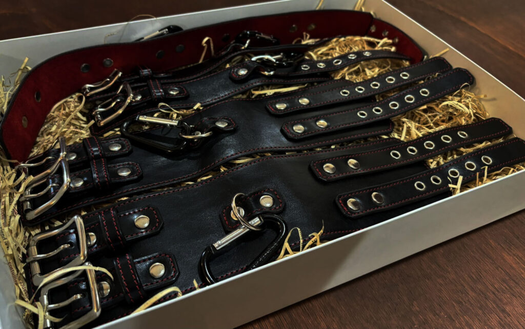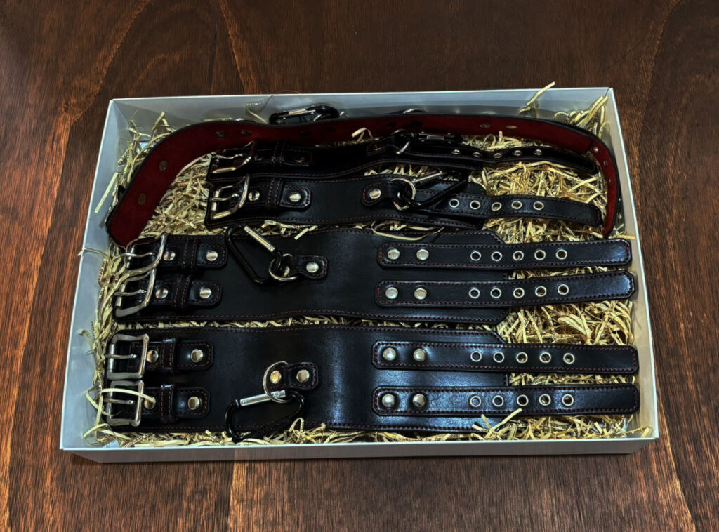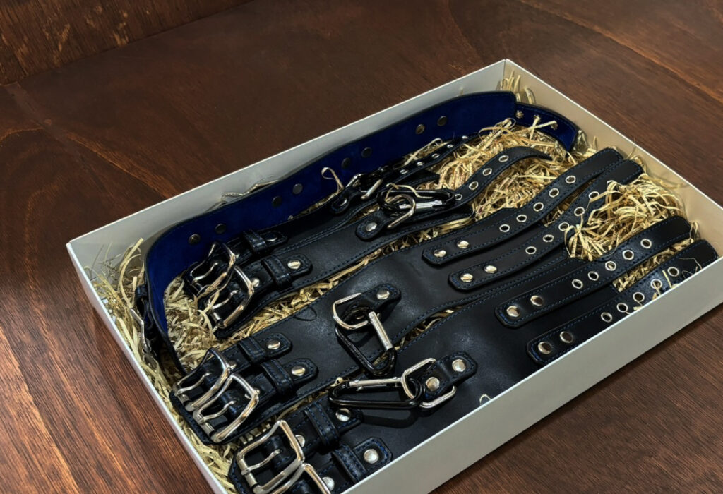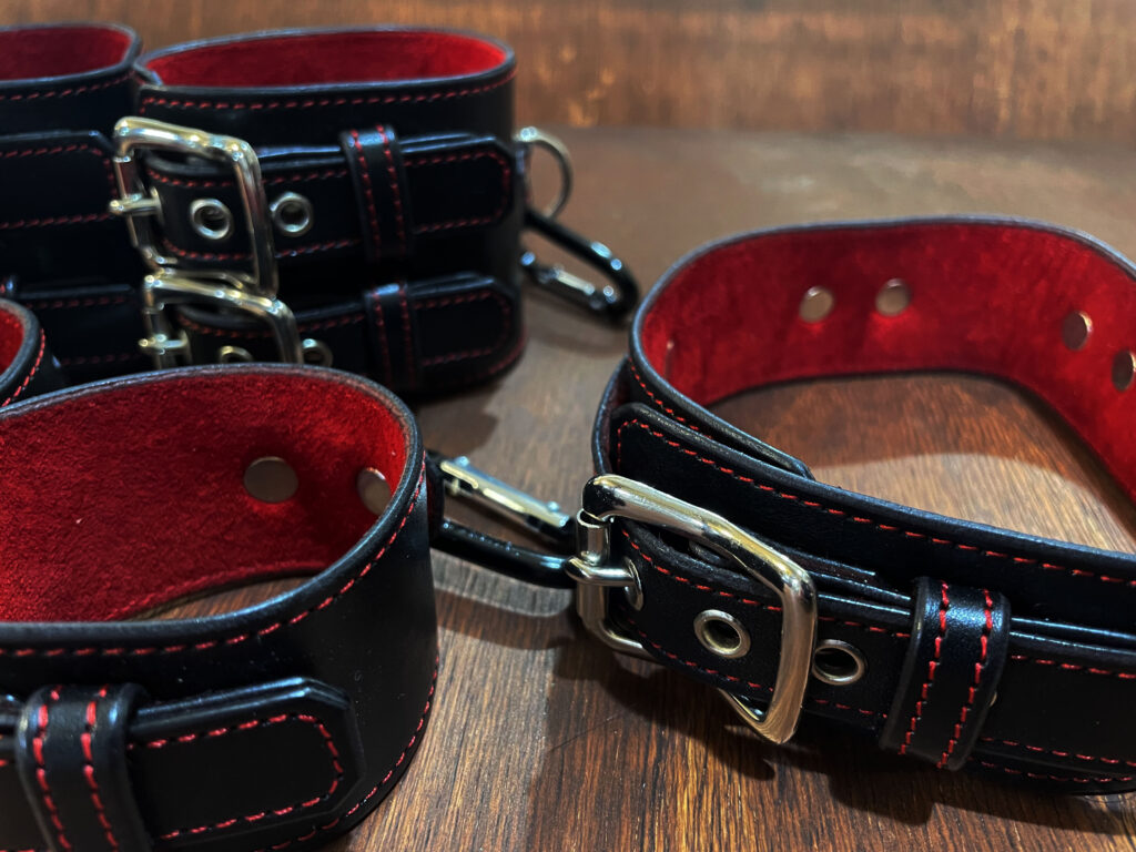 上質な本革を贅沢に使用し、熟練の職人が丹念に仕上げた手枷・足枷・首枷をひとつにまとめた「スタンダードセット」です。しなやかで強靭な革の質感は、装着した瞬間から重厚な存在感を放ち、カップルの時間をより濃密に演出します。各アイテムには精緻なステッチが施され、統一感のある高級感あふれるデザインに仕上げました。裏地には柔らかなスウェード素材を採用し、赤・青の2色からお選びいただけます。肌に優しく快適にフィットしつつ、確かな拘束感を提供する構造は長時間の使用でも安心。単品での使用はもちろん、3点を組み合わせることで一体感と没入感が生まれ、信頼と高揚をより深く共有できます。大人の遊びを支える基本のセットとして最適な逸品です。